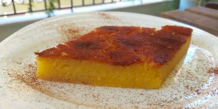 Την ψήνουμε σε προθερμασμένο φούρνο στους 200°C μέχρι να πήξει. Προσέχουμε μην την παραψήσουμε. Όταν κρυώσει λίγο, πασπαλίζουμε στην επιφάνεια χοντρή ζάχαρη και ψιλή κανελίτσα.