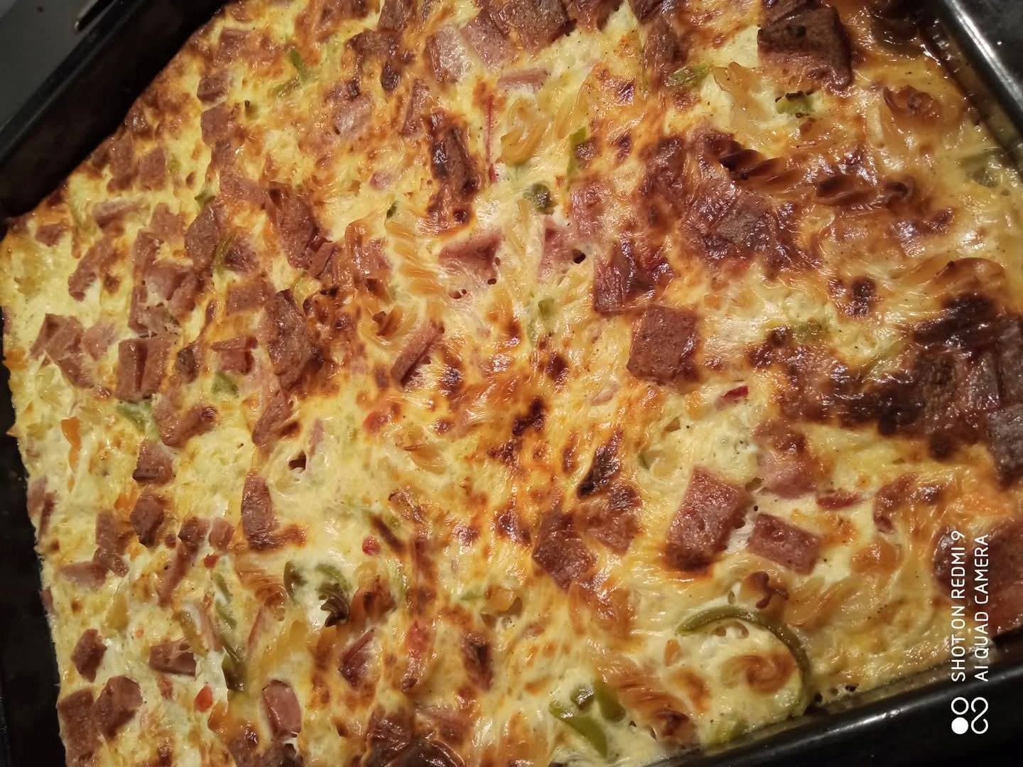 Προσθεστε απο πάνω το γάλα 2 κουταλιες βιταμ, τα αλλαντικα, πιπεριές κομμενες σε κυβακια, την παρμεζάνα τα αυγά και την φέτα.