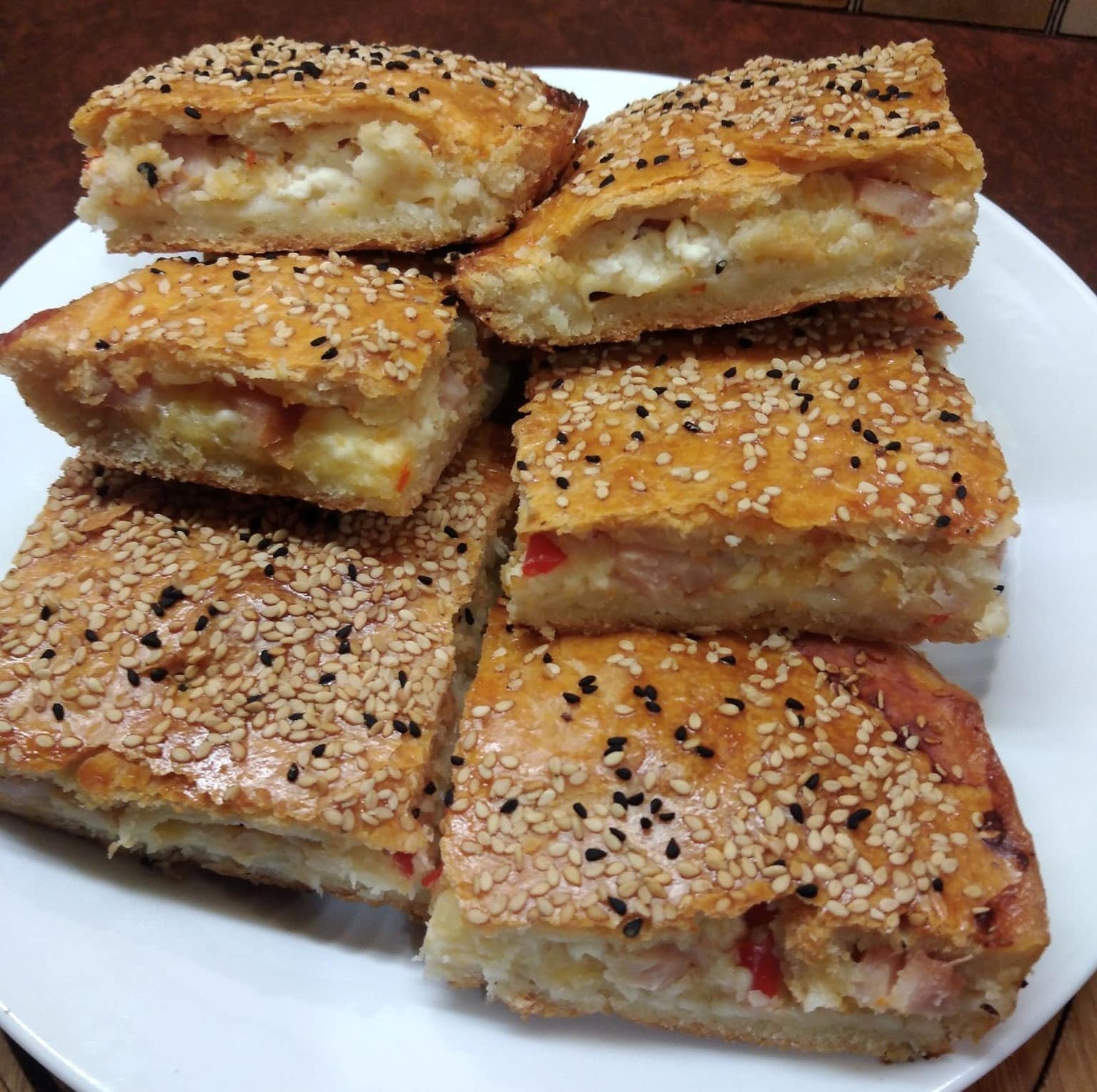 Ανοίγω το υπόλοιπο ζυμαρι με τον πλάστη, σκεπάζω την πίτα, περνάω με χτυπημένο αυγό, σουσάμι μαύρο κούκι προαιρετικό