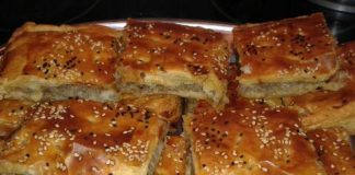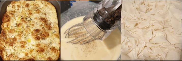 Σε ένα μπολ ρίχνουμε 1 φλιτζάνι γάλα, 3-4 αυγά, 2 κουταλιές της σούπας αλεύρι, μαύρο πιπέρι και προσθέτουμε μια πρέζα τριμοσχοκάρυδο και ανακατέψτε καλά. Ρίχνουμε αυτό το μείγμα πάνω από την πίτα και αφήνουμε στην άκρη για 5 λεπτά να απορροφηθεί.