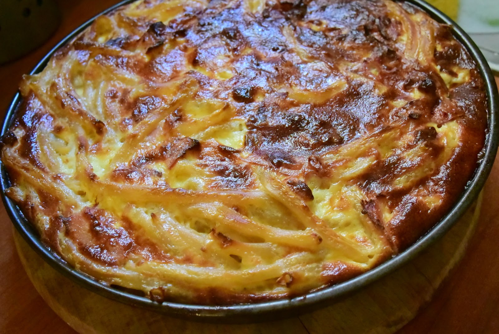 Ρίχνουμε αυτό το μείγμα ομοιόμορφα πάνω από τη μακαρονόπιτα. Κουνάμε το ταψί να πάει παντού και το πιέζουμε λίγο με ένα κουτάλι για να εισχωρήσει το υλικό.