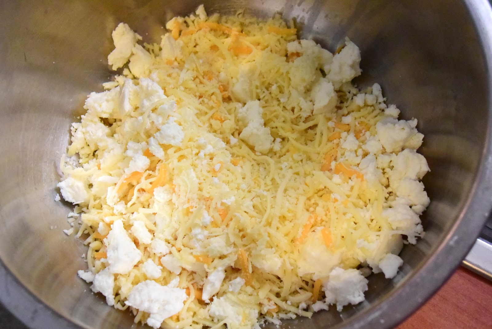 Σε ένα μπολ, ανακατεύουμε όλα τα τυριά (mix, κεφαλοτύρι, φέτα) με το πιπέρι.