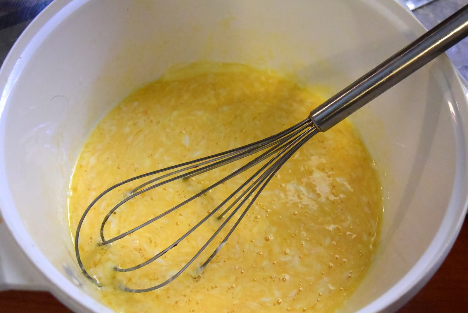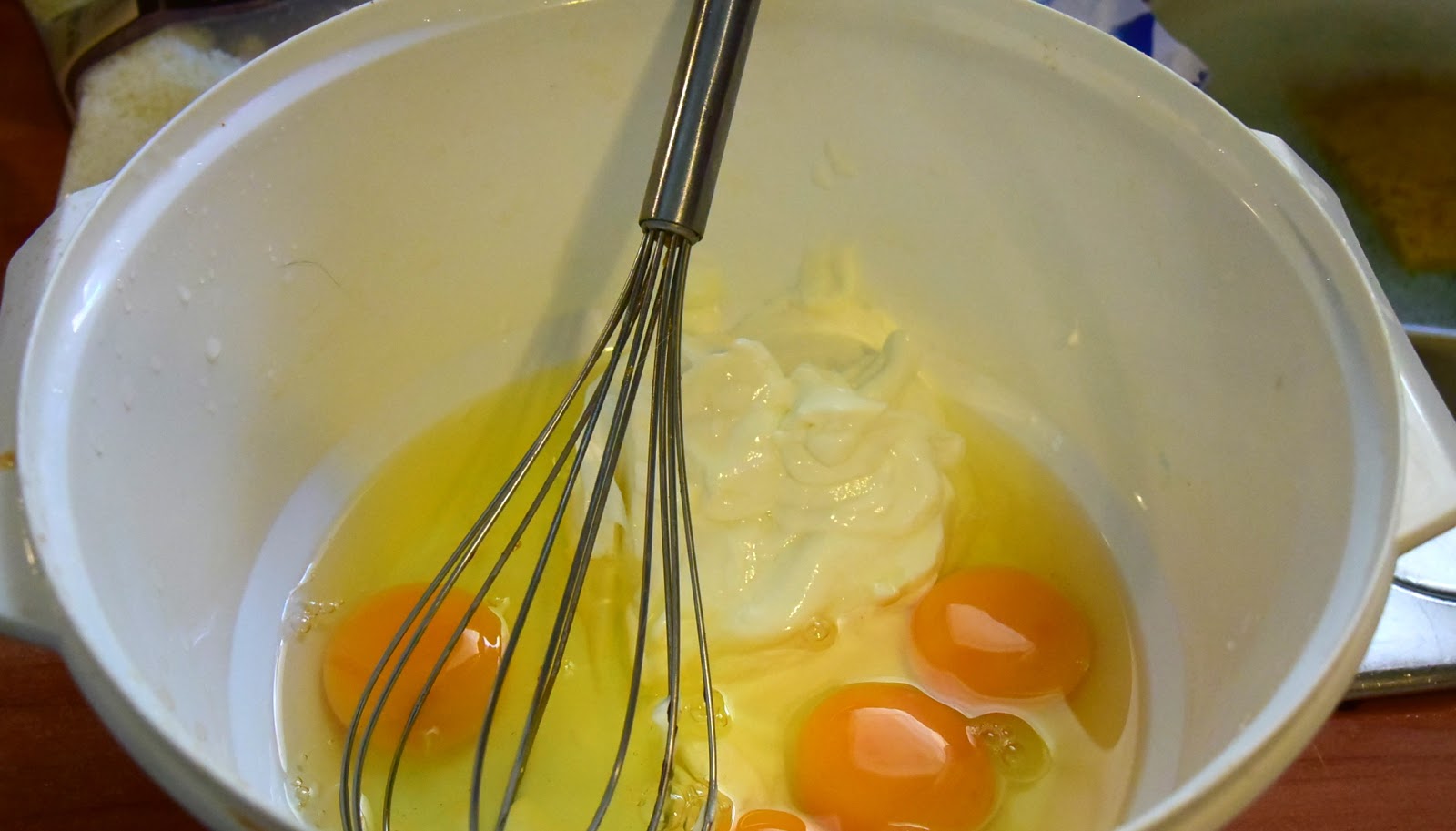Σε ένα μπολ, χτυπάμε το γιαούρτι λίγο με τον αυγοδάρτη. Προσθέτουμε χτυπώντας και τα αυγά μέχρι να ομογενοποιηθεί το μείγμα.