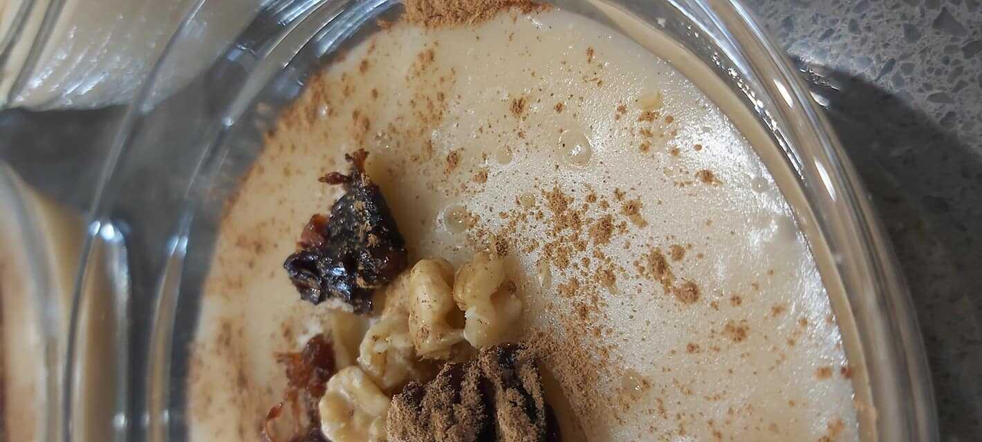 Βάζουμε να σιγοβράσει και ανακατεύουμε συχνά. Όταν πήξει αρκετά, τοποθετούμε σε ρηχά μπωλ. Προσθέτουμε το καρύδι, τη κανέλα, τα δαμάσκηνα και τους χουρμάδες σε κομματάκια.