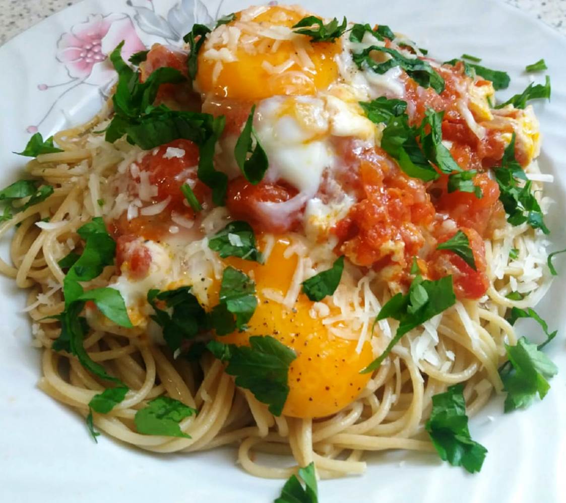 Σωταρισα σε μέτρια θερμοκρασία το κρεμμύδι κάπως χοντροκομμένο σε ελαιόλαδο μέχρι να μαραθεί λίγο. Πρόσθεσα το σκόρδο σε φετουλες, 2-3 βόλτες κι έριξα τις τριμμένες ντομάτες. Αλατοπίπερο, μισή κουταλιά μέλι , λίγο κρόκο Κοζάνης, κουρκουμά ( δικές μου προσθήκες αυτά) κι άφησα να σιγοβράζει. Παράλληλα εβρασα και το σπαγγέτι al dente , το σουρωσα κι έριξα ελάχιστο ελαιόλαδο για να μην κολλήσει. Μετά από κάνα 20λεπτο μελωσε η σάλτσα ( να έχει λίγα υγρά) έριξα τα αυγά μάτια, τα αλατοπιπέρωσα κι έσβησα το μάτι. Σιγοψηθηκαν για 5′-6′. Πασπάλισα λίγη γραβιέρα και τρυφερό μαϊντανό. Στο σερβίρισμα πρώτα γραβιέρα, με σπάτουλα σάλτσα με αυγά , εξτρά μαϊντανό και λίγο ελαιόλαδο. Για κάποιο λόγο η ντομάτα είναι ιδιαίτερα μυρωδάτη και το αυγό δίνει ανεπαίσθητη γλύκα και υγρασία , αν και δεν μπορείς να το διακρίνεις. Απόλυτα δεμένες και ισορροπημένες όλες οι γεύσεις. Για μένα η μοναστηριακη κουζίνα πέραν από υγιεινή, είναι απολαυστική , μέσα στη λιτότητά της.