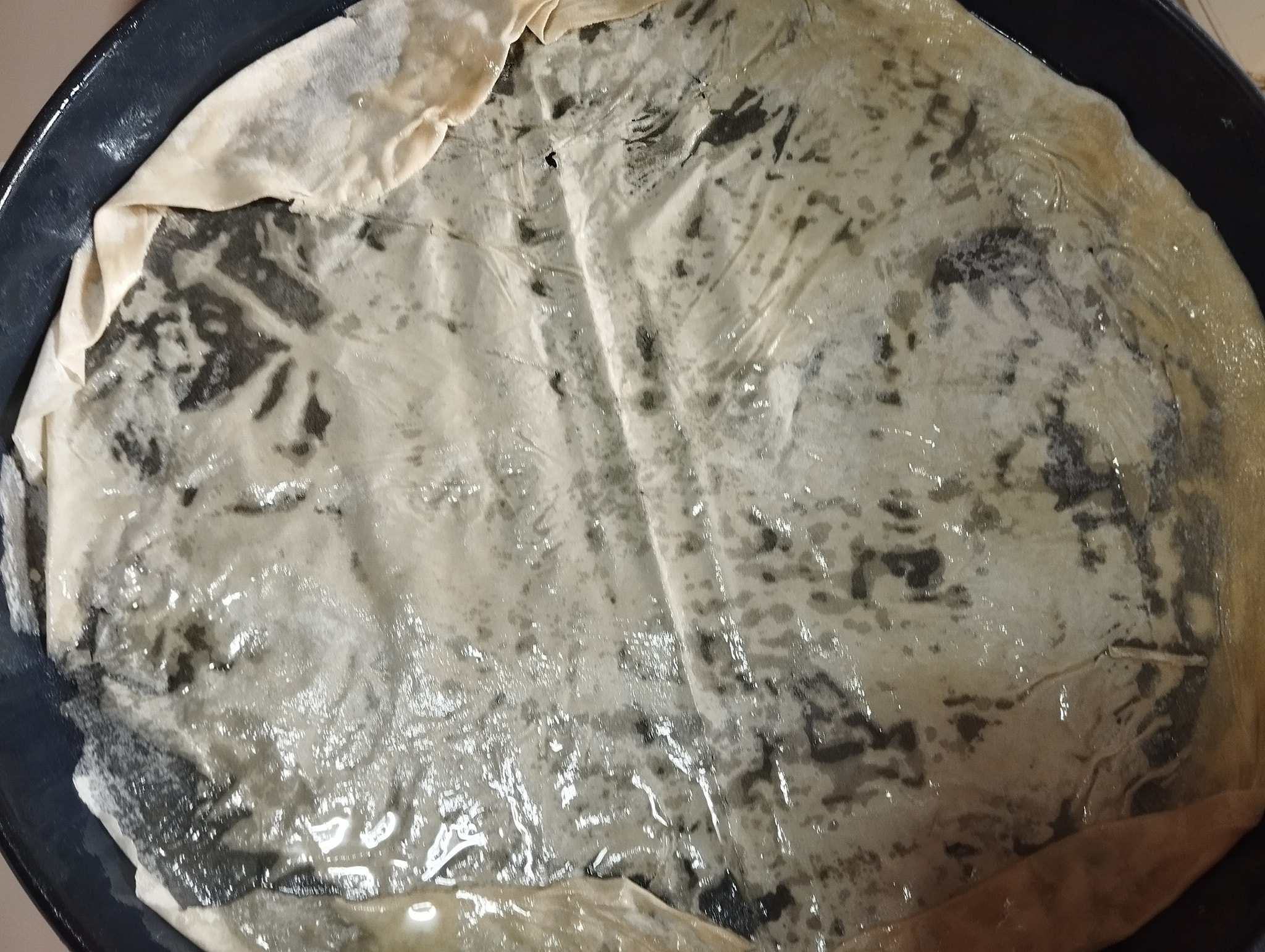Λαδώστε ένα ταψί. Στρώστε το πρώτο φύλλο και λαδώστε το.