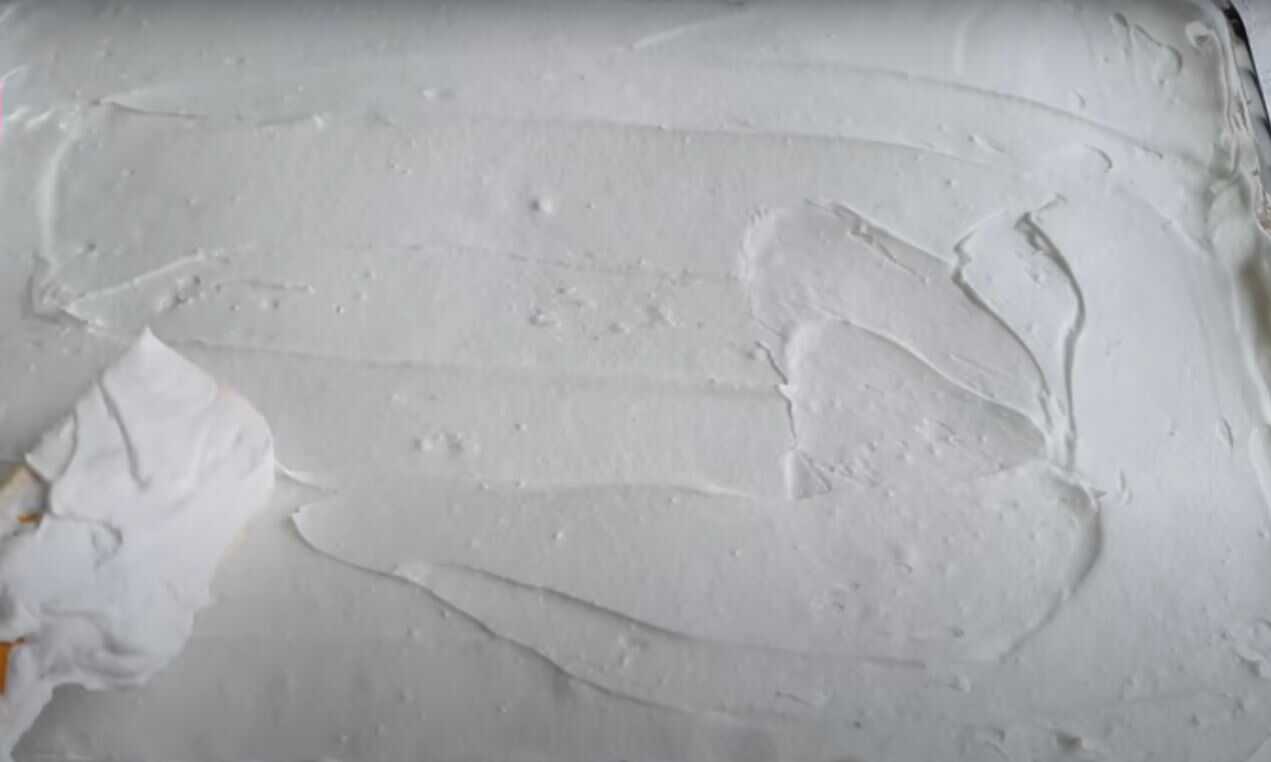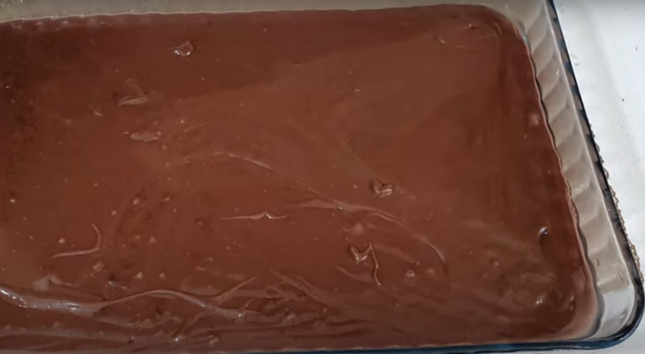 Βγάζουμε το πυρέξ από το ψυγείο και απλώνουμε την σαντιγί πάνω από την σοκολάτα