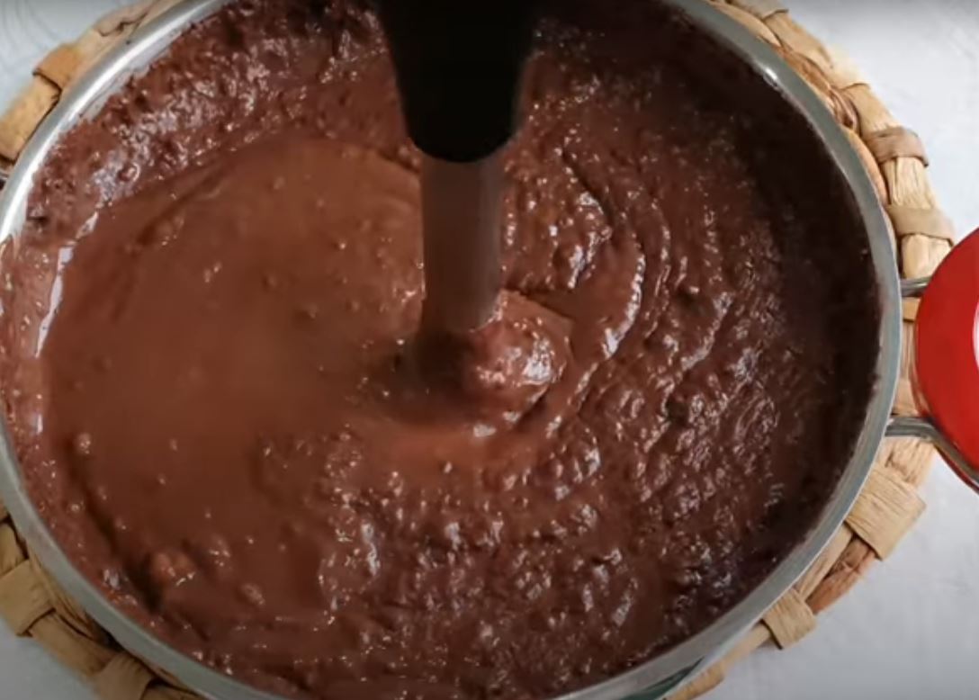 Βάζουμε την κατσαρόλα στην φωτιά και ανακατευουμε μέχρι να πήξει, μετά κατεβάζουμε από την φωτιά και συνεχίζουμε το ανακάτεμα διαλλυματικά μέχρι να κρυώσει και να πάρουμε μια σκουρα κρεμα σοκολάτα.