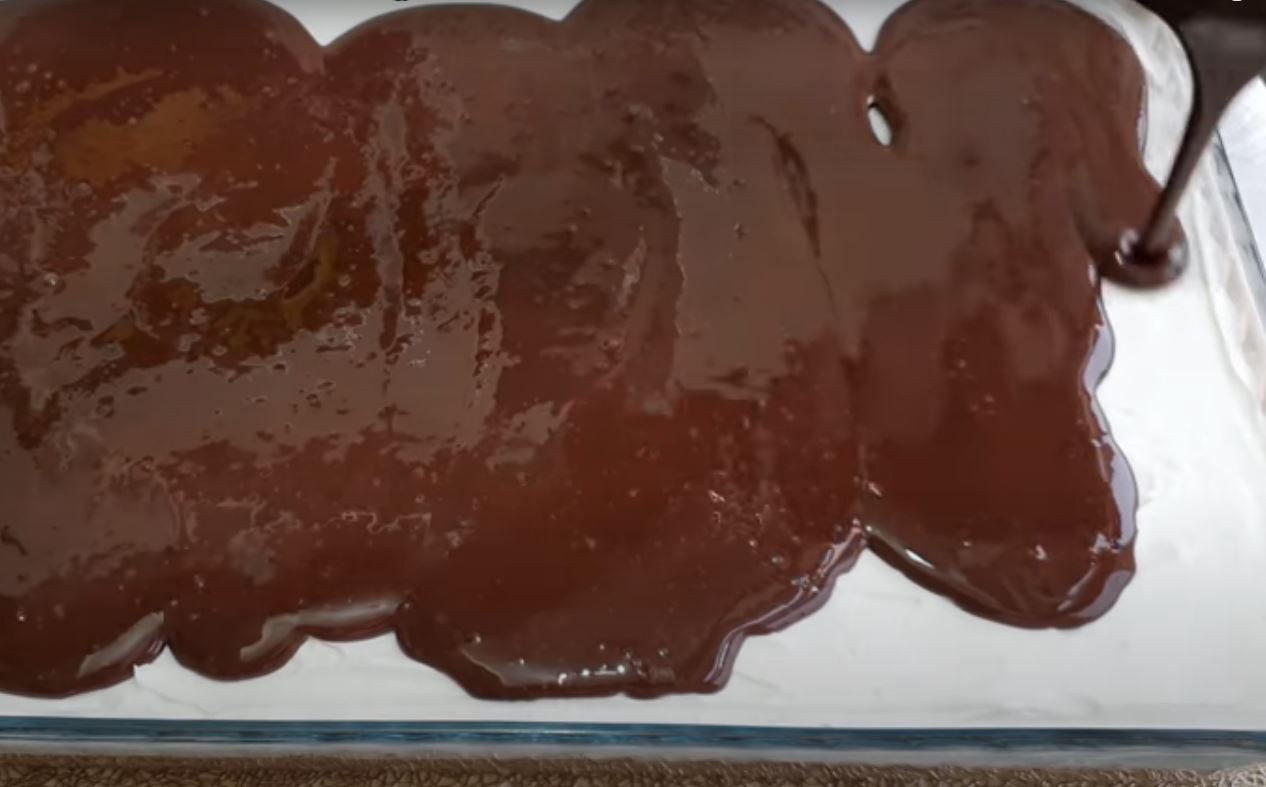 Αφήνουμε την σάλτσα σοκολάτα να κρυωσει λίγο και την αδείαζουμε πάνω στην σαντιγί και την απλώνουμε.