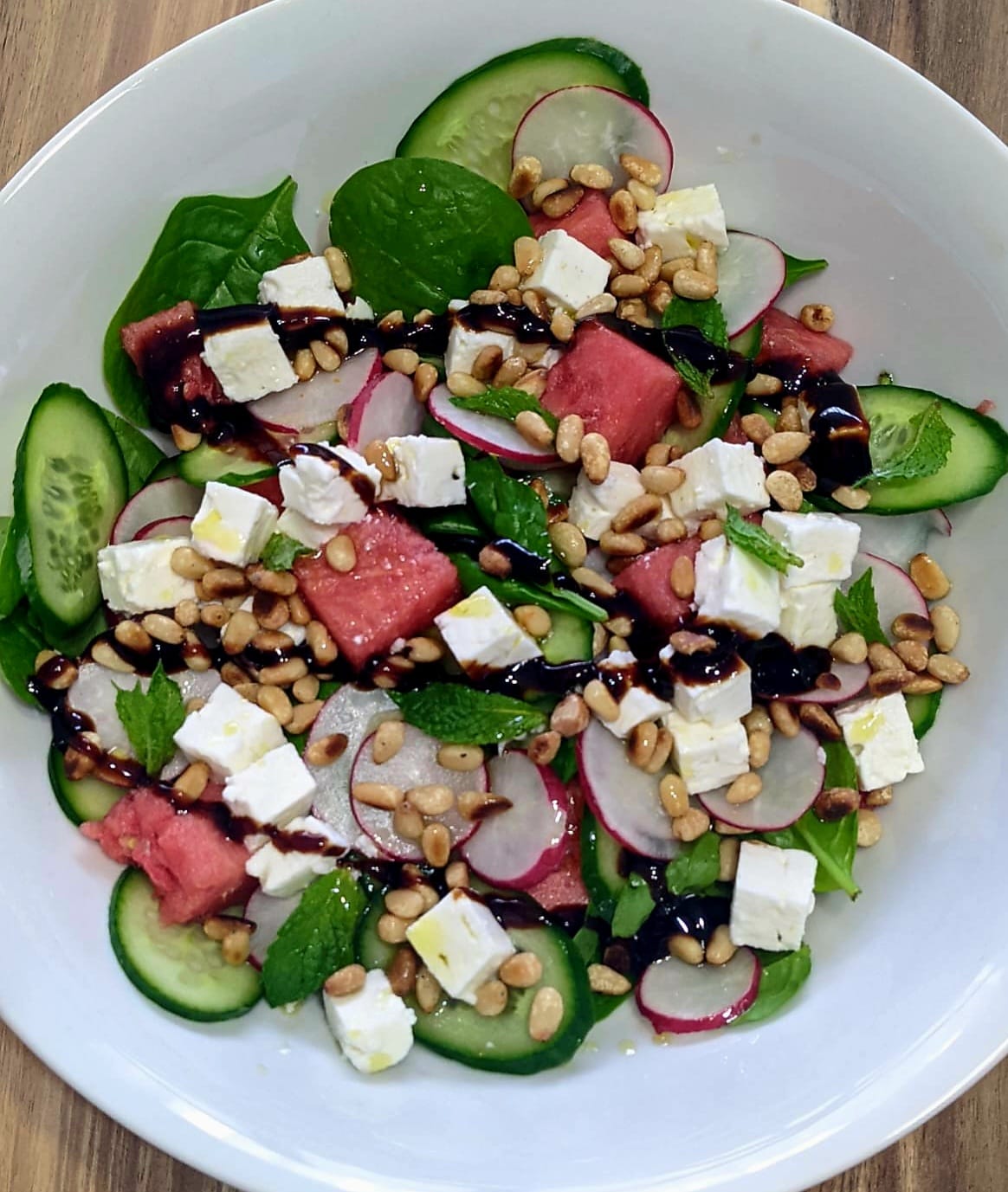 Σαλάτα με σπανάκι, ραπανάκι, φέτα σε κύβους, καρπούζι, αγγούρι, ψητό κουκουνάρι λίγο δυόσμο