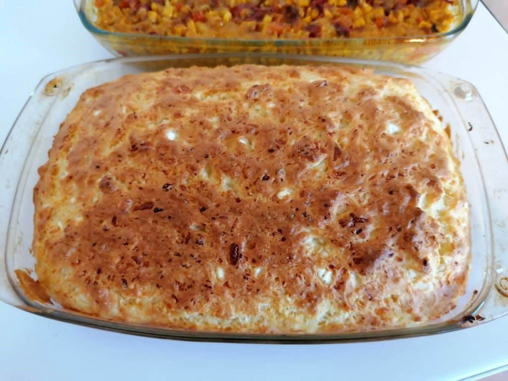 Ρίξτε το μείγμα σε ένα ταψί που έχετε λαδώσει και αλευρώσει ελαφρά.