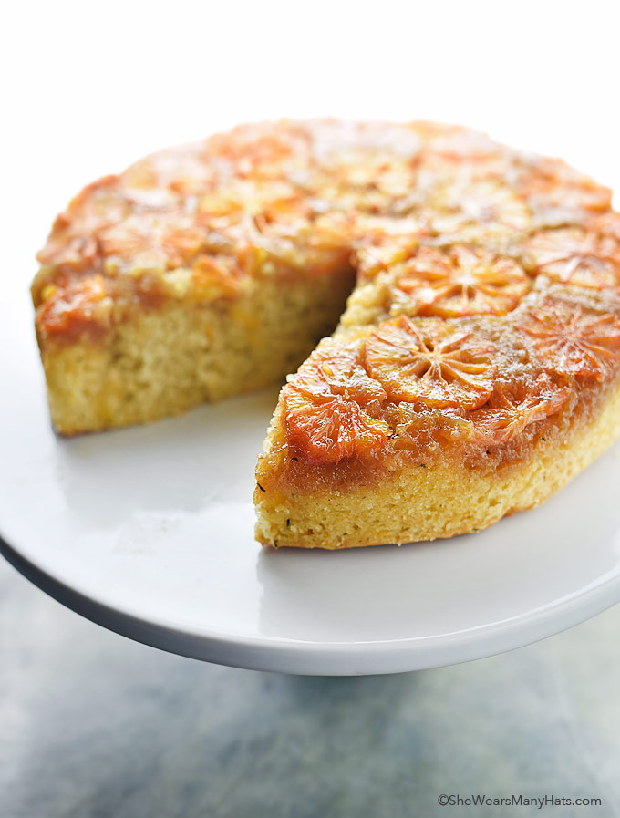 Λιώνετε 1/4 φλιτζάνι βούτυρο σε ένα στρογγυλό ταψάκι 20-22 ή ορθογώνιο στο φούρνο μέχρι να λιώσει. Αφαιρέστε προσεκτικά από το φούρνο. Ανακατέψτε την καστανή ζάχαρη στο λιωμένο βούτυρο μέχρι να συνδυαστεί. Τοποθετήστε ξανά στο φούρνο για 3 λεπτά. Αφαιρέστε από το φούρνο και χτυπήστε στο ελαφρά και απλώνεται ομοιόμορφα στο κάτω μέρος του ταψιού. Στρώστε τις φέτες πορτοκαλιού ομοιόμορφα πάνω από το βούτυρο / ζάχαρη. Κρατήστε επιπλέον φέτες για γαρνίρισμα. Αφήνω στην άκρη.