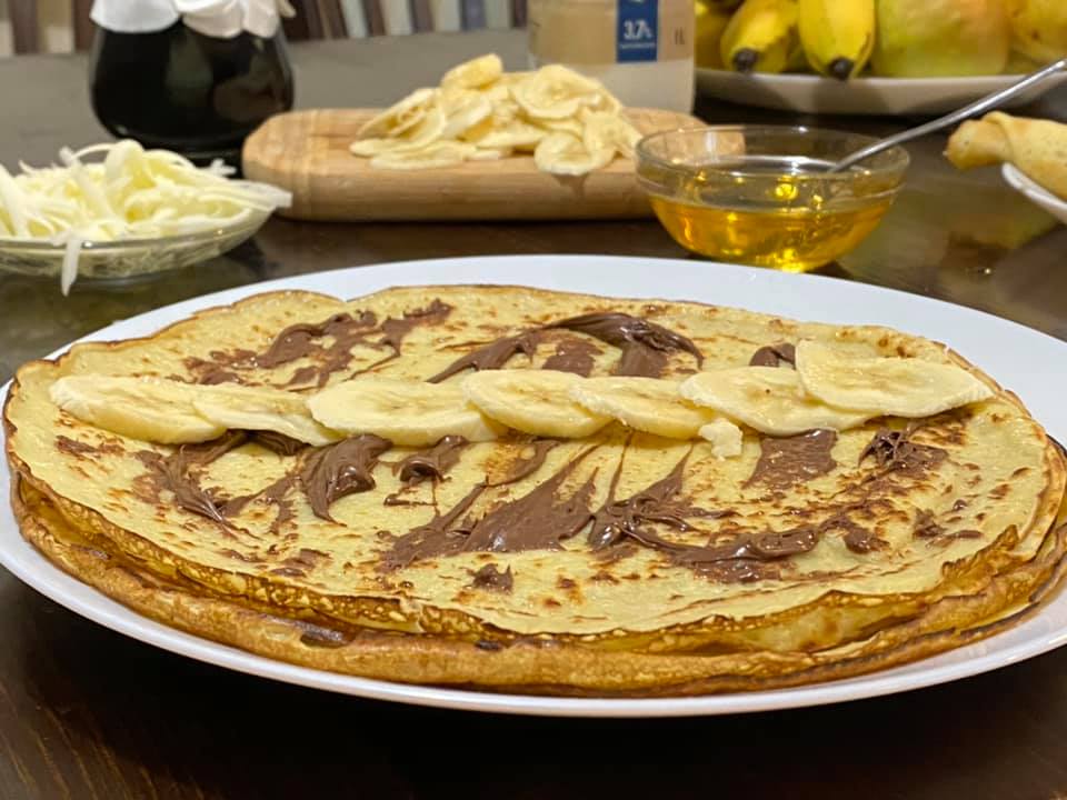 Σερβίρετε τις τελικές τηγανίτες με σπιτική μαρμελάδα, σοκολάτα με μπανανα που έκανα εγω.