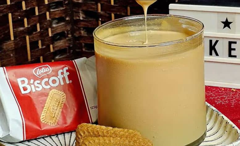 Πλούσια και ρευστή πραλίνα Lotus με λευκή σοκολάτα σερβιρισμένη σε γυάλινο βάζο με μπισκότα Lotus στο φόντο