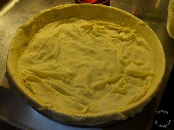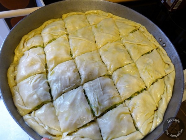 Συνεχίζουμε με τα υπόλοιπα τρία φύλλα πάντα αλείφοντας με ελαιόλαδο. Γυρίζουμε προς τα μέσα το μέρος των φύλλων που εξήχε του ταψιού δημιουργώντας τον κόθρο. Κόβουμε την πίτα με κοφτερό μαχαίρι.
