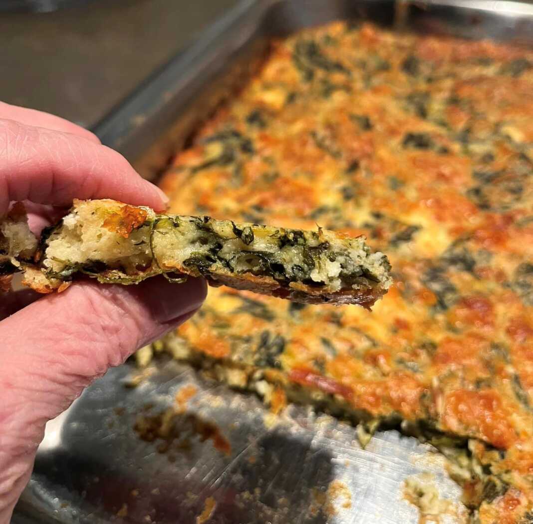 Μεταφέρετε στο ταψί σας και απλώστε ομοιόμορφα. Πασπαλίζουμε από πάνω με τριμμένη παρμεζάνα και ψήνουμε για 40-45 λεπτά ή μέχρι να πάρει χρυσαφί χρώμα. Βγάζουμε από το φούρνο και αφήνουμε να κρυώσει για 15 λεπτά πριν το κόψουμε.