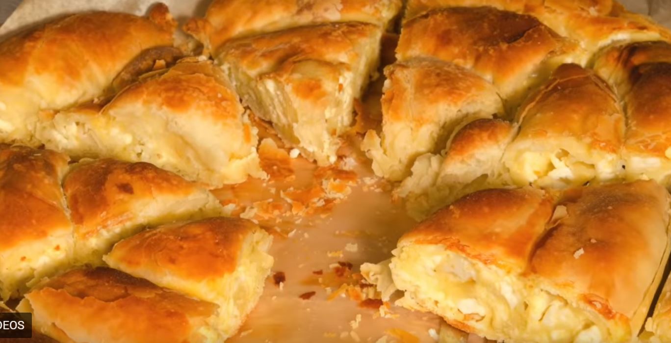 Ραντίζουμε δηλαδή με το υγρό μείγμα και πασπαλίζουμε, ενδιάμεσα, με τα υπόλοιπα τυριά. Γυρνάμε τις άκρες των φύλλων προς τα μέσα, πάνω στην πίτα. Τέλος, καλύπτουμε την πίτα με το τελευταίο φύλλο.