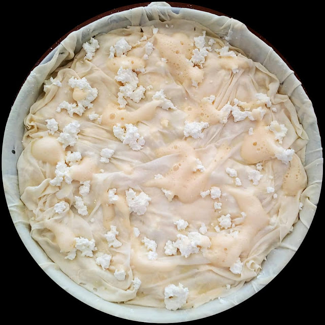 Ανοίγουμε 9 λεπτά φύλλα λαδώνουμε και το ταψί 36-38 εκ.,βάζουμε κάτω φύλλο και τυριά.