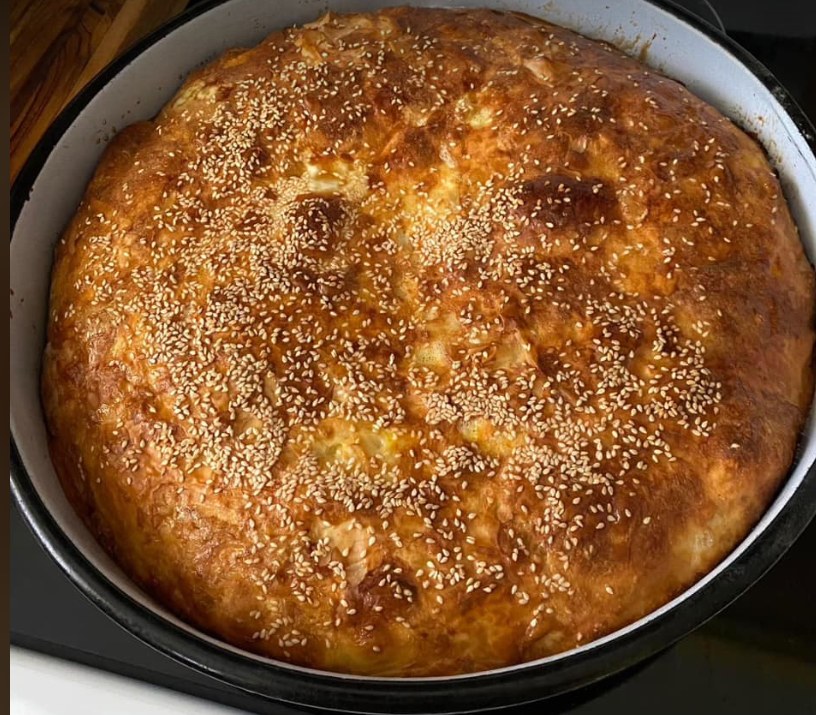 Ρίχνουμε το μείγμα σε ένα λαδωμένο ταψί 30×25 εκ. με λαδόκολλα, τρίβουμε από επάνω τα 60 γρ. φέτα και πασπαλίζουμε με μπόλικο σουσάμι. Ψήνουμε σε προθερμασμένο φούρνο στις αντιστάσεις στους 170 για περίπου 40′.Εγω εκανα διπλη δοση για να ειναι μπαμπατσκια και μπολικη οπως ελεγε η συχωρεμενη η γιαγια μου.