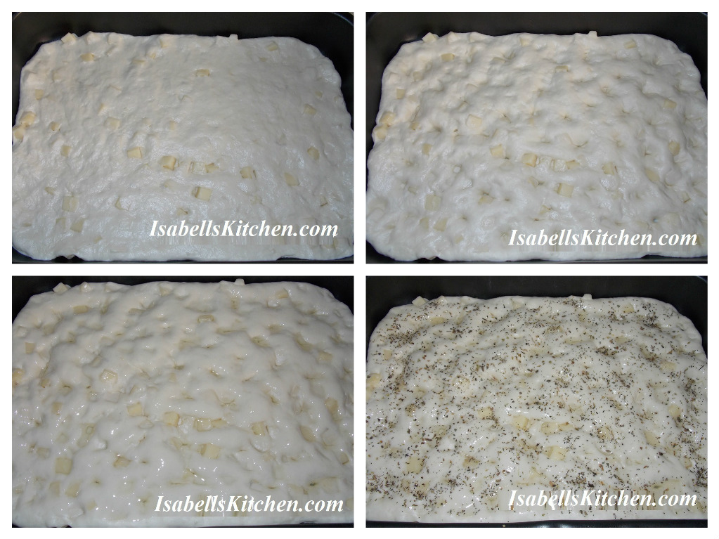 Τρυπήστε τη ζύμη με τα δάχτυλά σας μέχρι να αγγίξετε το ταψί, κάνοντας μικρές τρύπες.