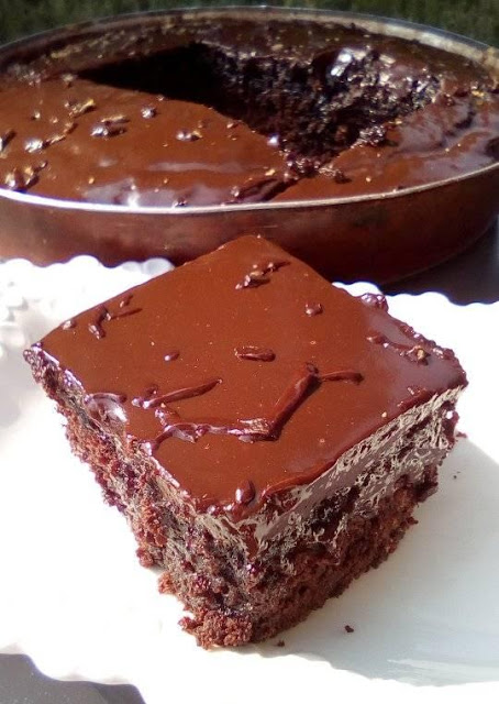 Τρυπάμε παντού την σοκολατόπιτα με ξυλάκι από σουβλάκι και χλιαρή ρίχνουμε καυτό σιρόπι!