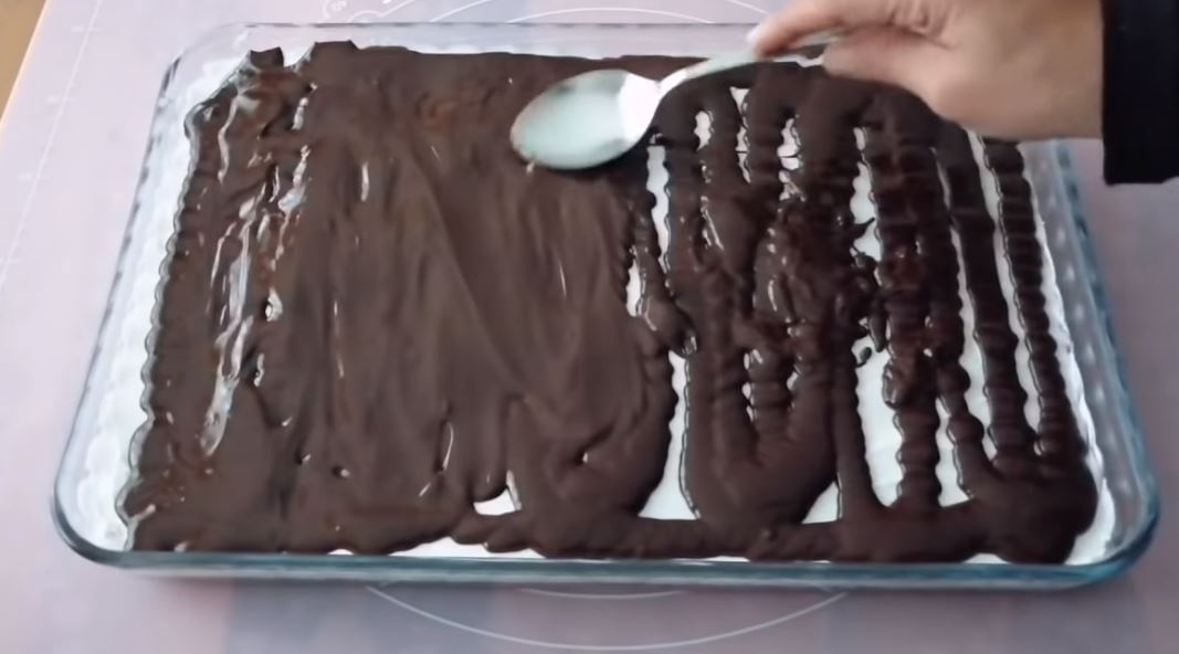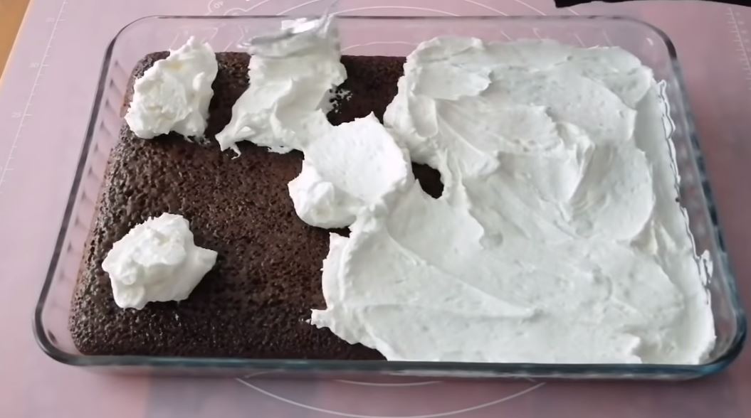 Απλωσα την κτυπημένη κρέμα πάνω από το κρύο κέικ και με ένα κουτάλι και το έβαλα στο ψυγείο.