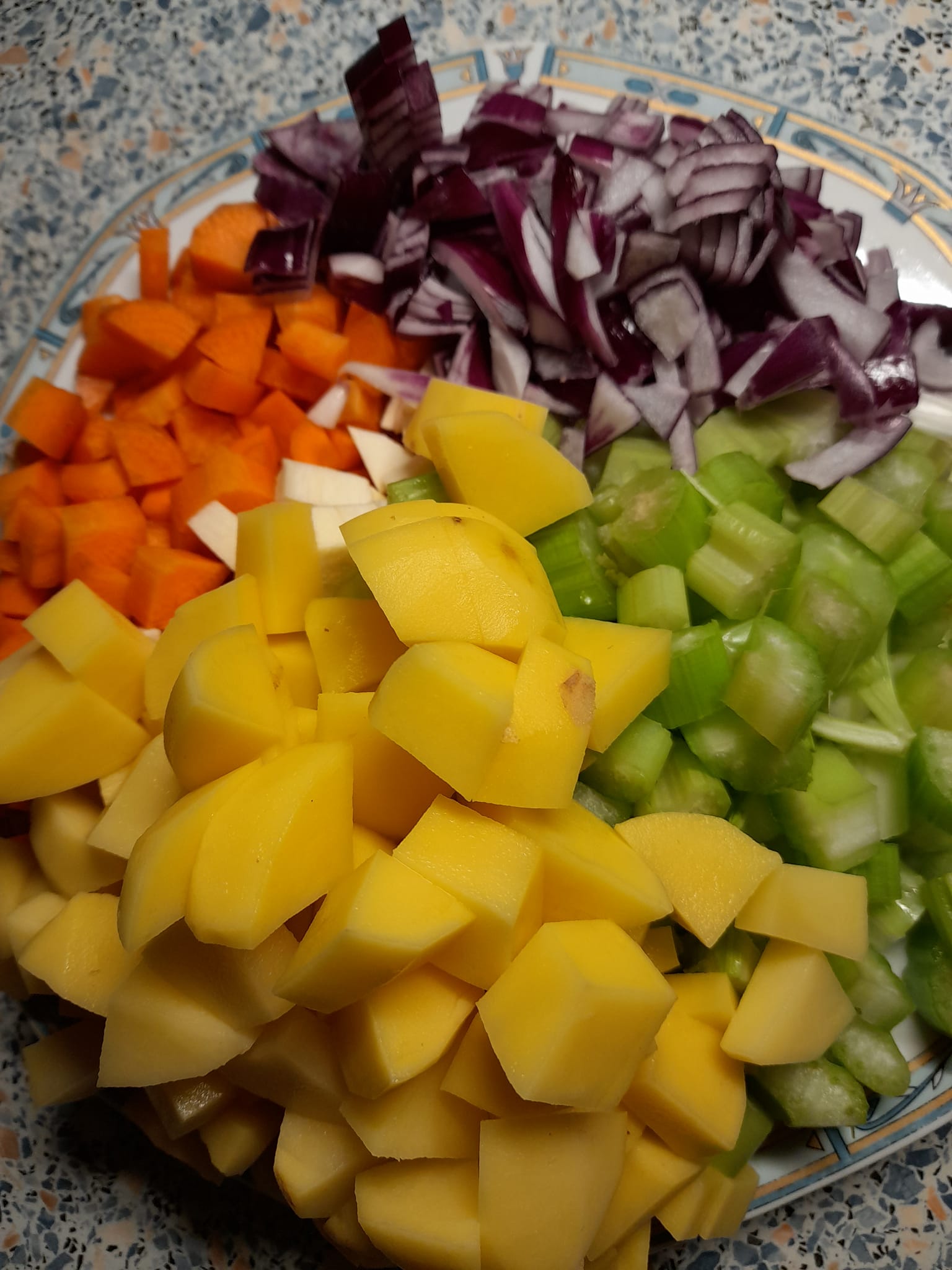 Για βραδινό έφτιαξα μια πολύ νόστιμη και θρεπτική σούπα λαχανικών από πατάτες, παστινάκια, καρότα, κόκκινα κρεμμύδια και σέλινο.
