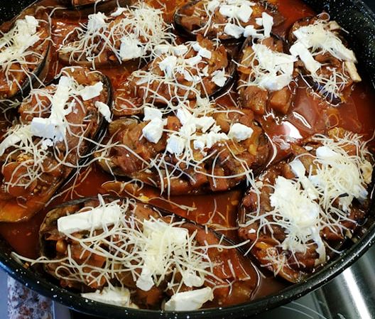 Αφαιρείτε τη γέμιση απ’ τη φωτιά και την αφήνετε να κρυώσει λίγο για να είναι πιο εύκολο να γεμίσετε τις μελιτζάνες. Παράλληλα τρίβετε το τυρί που θα χρησιμοποιήσετε.