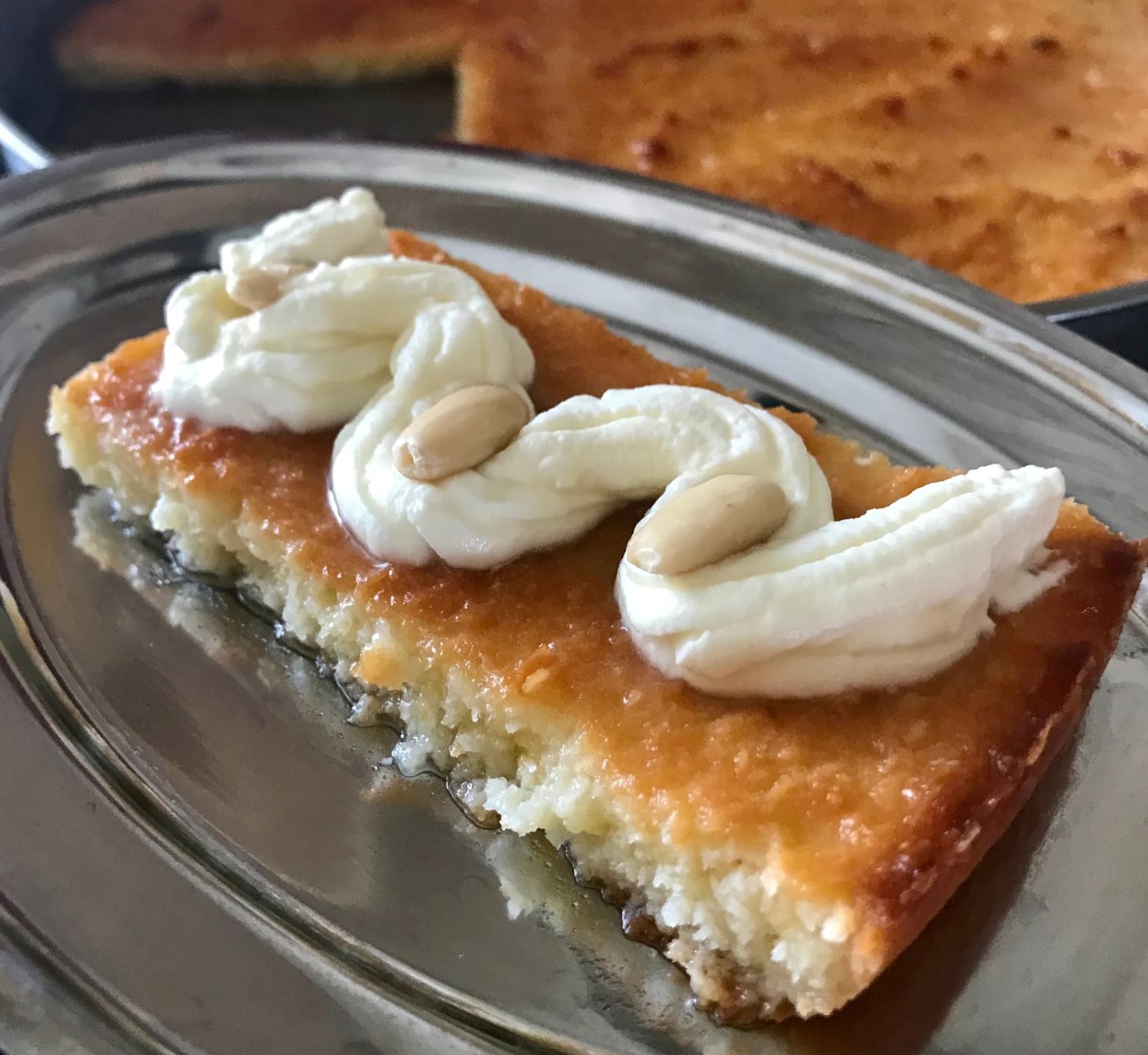 Την άλλη μέρα, γαρνίρουμε την επιφάνεια, με τριμμένη καρύδα, η σαντιγί και αμύγδαλα, κόβουμε κομμάτια, και απολαμβάνουμε, την αφράτη, δροσερή, και σιροπιασμένη, πίτα μας.