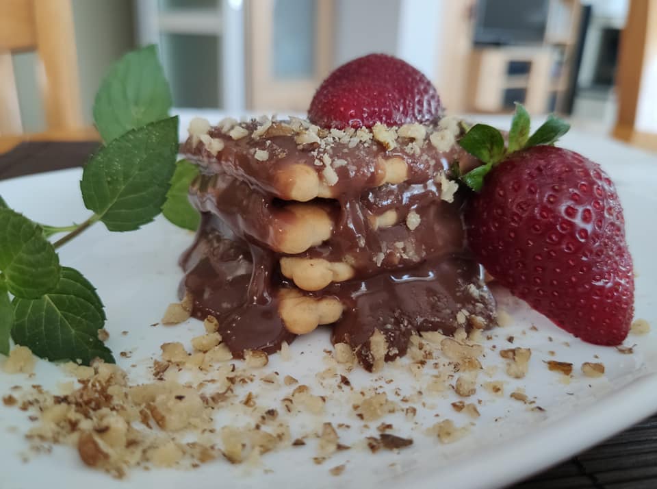 Ανακάτεψα την κρέμα και τη σοκολάτα. Μούσκεψα ελαφρά τα μπισκότα σε ζεστό γάλα. Χρησιμοποίησα 4 μπισκότα για μία μερίδα. Ανάμεσα σε κάθε ένα έβαλα το μείγμα σοκολάτας και τα αλεσμένα καρύδια. Διακόσμησα με καρύδια, φράουλες και δυόσμο.