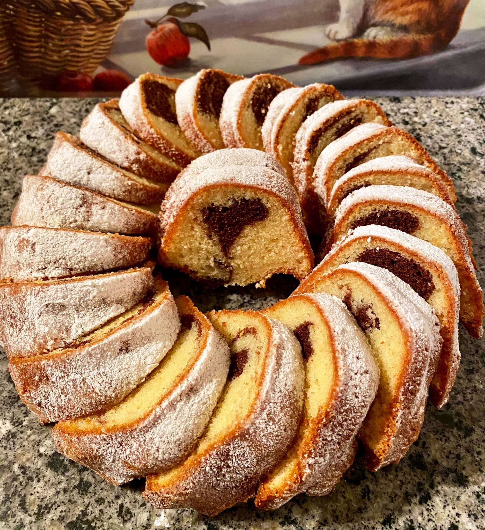 Χτύπησα καλά τα αυγά με το χυμό λεμονιού και τη ζάχαρη, πρόσθεσα την κρέμα γάλακτος, το λάδι, το άρωμα βανίλιας, το ξύσμα λεμονιού και το αλεύρι ανακατεμένο με το μπέικιν πάουντερ, χώρισα 6 κουταλιές της σούπας και ανακάτεψα με το κακάο, έβαλα τα μείγματα πρωτα λευκό μετα σοκολάτα και μετα λευκο πάλι σε βουτυρωμένη φόρμα για κέικ.