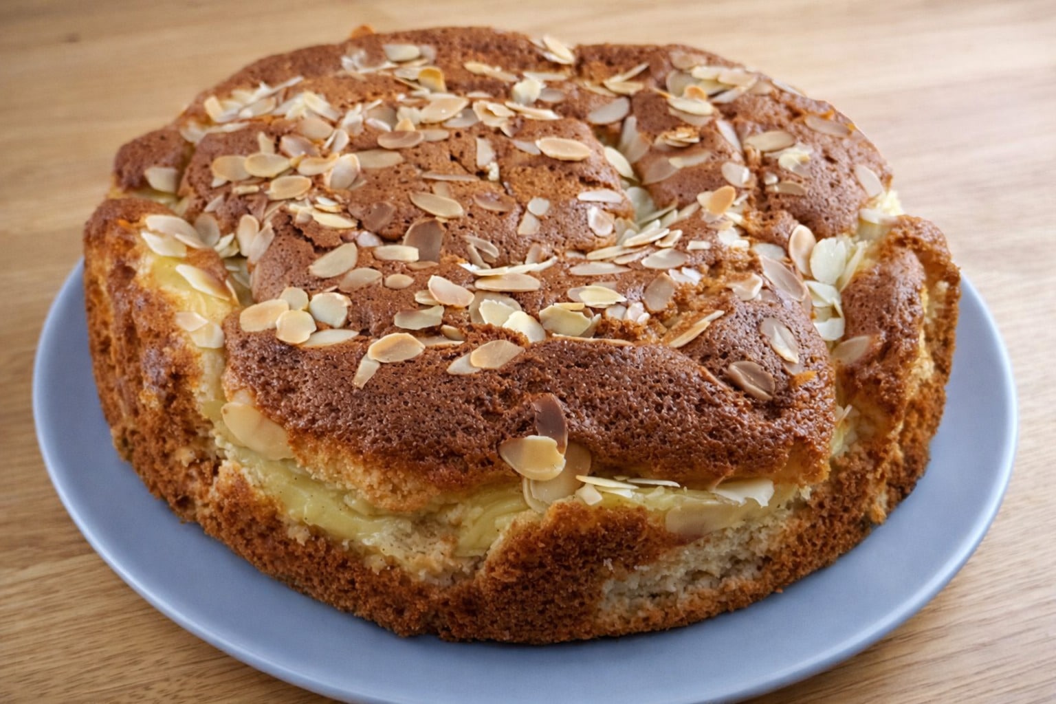 5. Ψήσιμο: Πασπαλίζουμε με τα αμύγδαλα και ψήνουμε σε προθερμασμένο φούρνο στους 180°C (πάνω-κάτω) στη δεύτερη σχάρα για περίπου 45 λεπτά