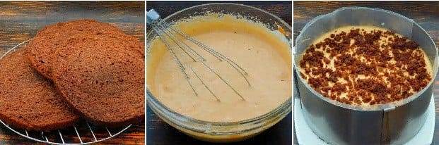 Βάλτε την πρώτη στρώση κέικ, απλώστε λίγη κρέμα. Επαναλάβετε με τις υπόλοιπες στρώσεις.