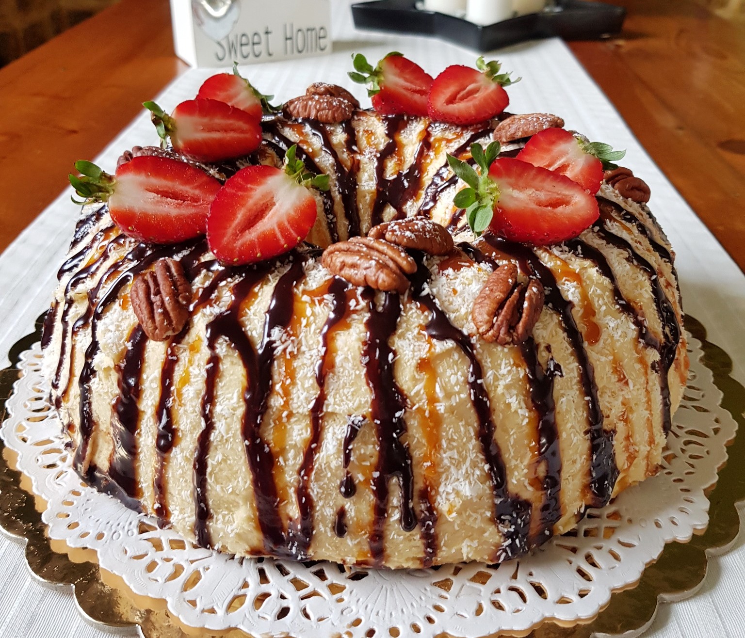 πολλή τριμμένη καρύδα, σοκολάτα και σάλτσα καραμέλας 🤤