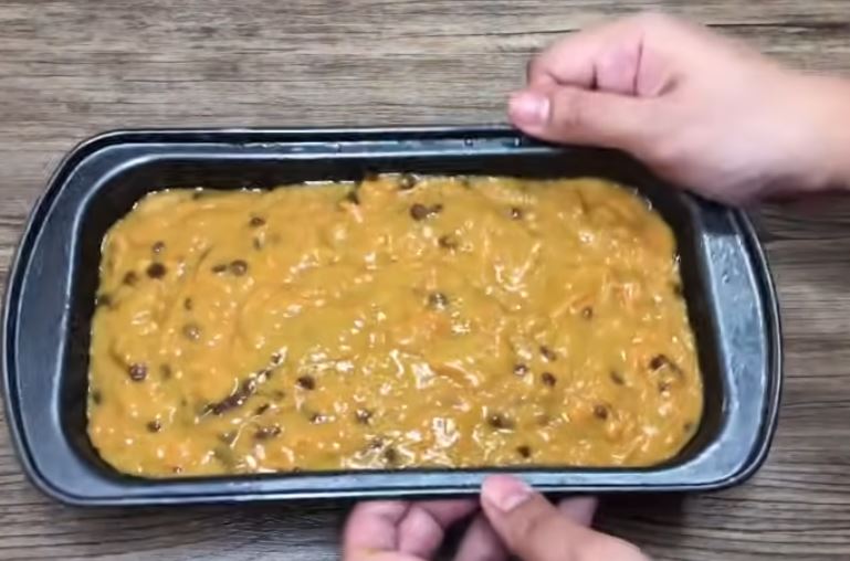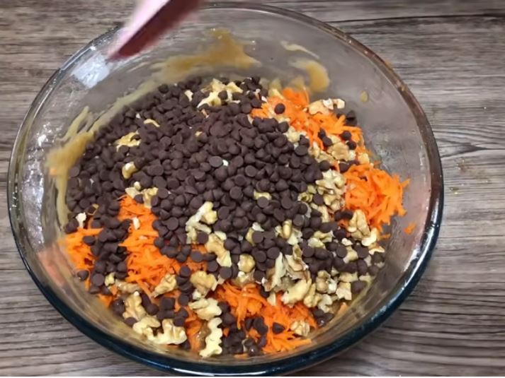 Σ αυτό το σημείο ρίχνουμε τα καρότα τριμμένα και στιμμένα, τα καρύδια και τις σταγόνες σοκολάτας. Ανακατεύουμε καλά.