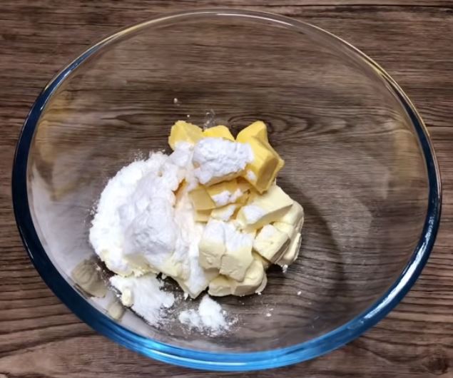 Βάζουμε σ ένα μπολ το τυρί κρέμα, το βούτυρο και την άχνη και χτυπάμε με το μίξερ σε δυνατή ταχύτητα μέχρι ν αφρατέψει.