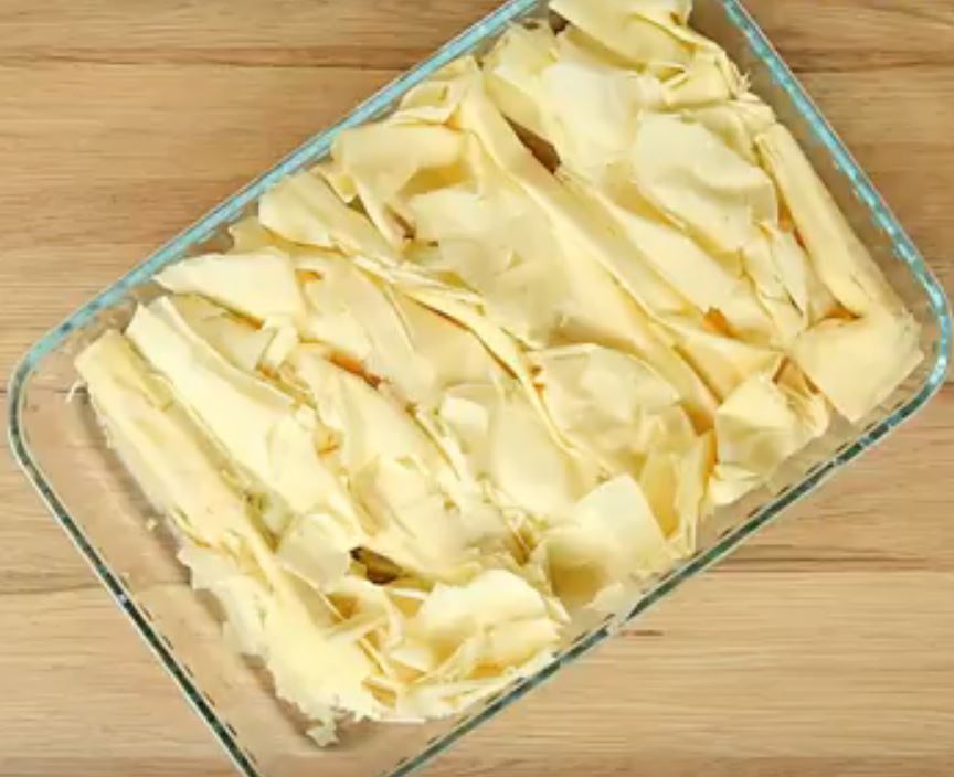 Γεμίστε ένα ταψί μεγέθους 33 x 23 x 5 cm με φύλλα Ψήνουμε για 30 λεπτά στους 170 ° C.