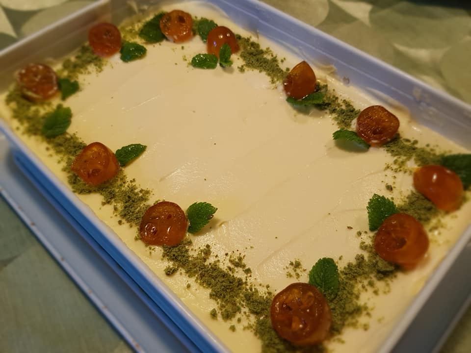 Το κέικ έχει φρέσκια, λεμονάτη και γλυκόξινη γεύση. Δεν είναι πολύ γλυκό. Η διακόσμηση είναι προαιρετική.