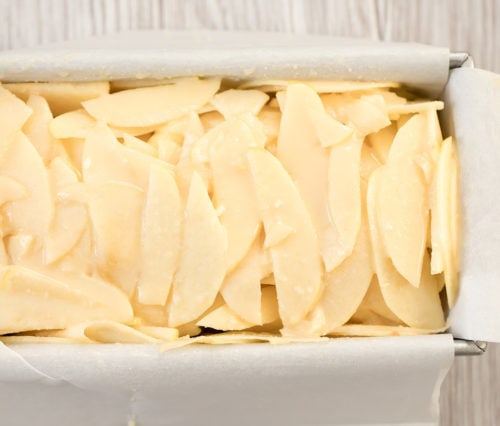 Προσθέστε περίπου το ήμισυ των μήλων σε φέτες στο μείγμα. Ξεχωρίστε τις κολλημένες φέτες πριν τις προσθέσετε. Χρησιμοποιήστε μια σπάτουλα από καουτσούκ για να ανακατεύετε τα μήλα μέχρι όλα αυτά να είναι επικαλυμμένα με μείγμα.