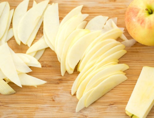 Ξεφλουδίστε τα μήλα και κόψτε πολύ λεπτές φέτες, πάχους περίπου 2 mm.