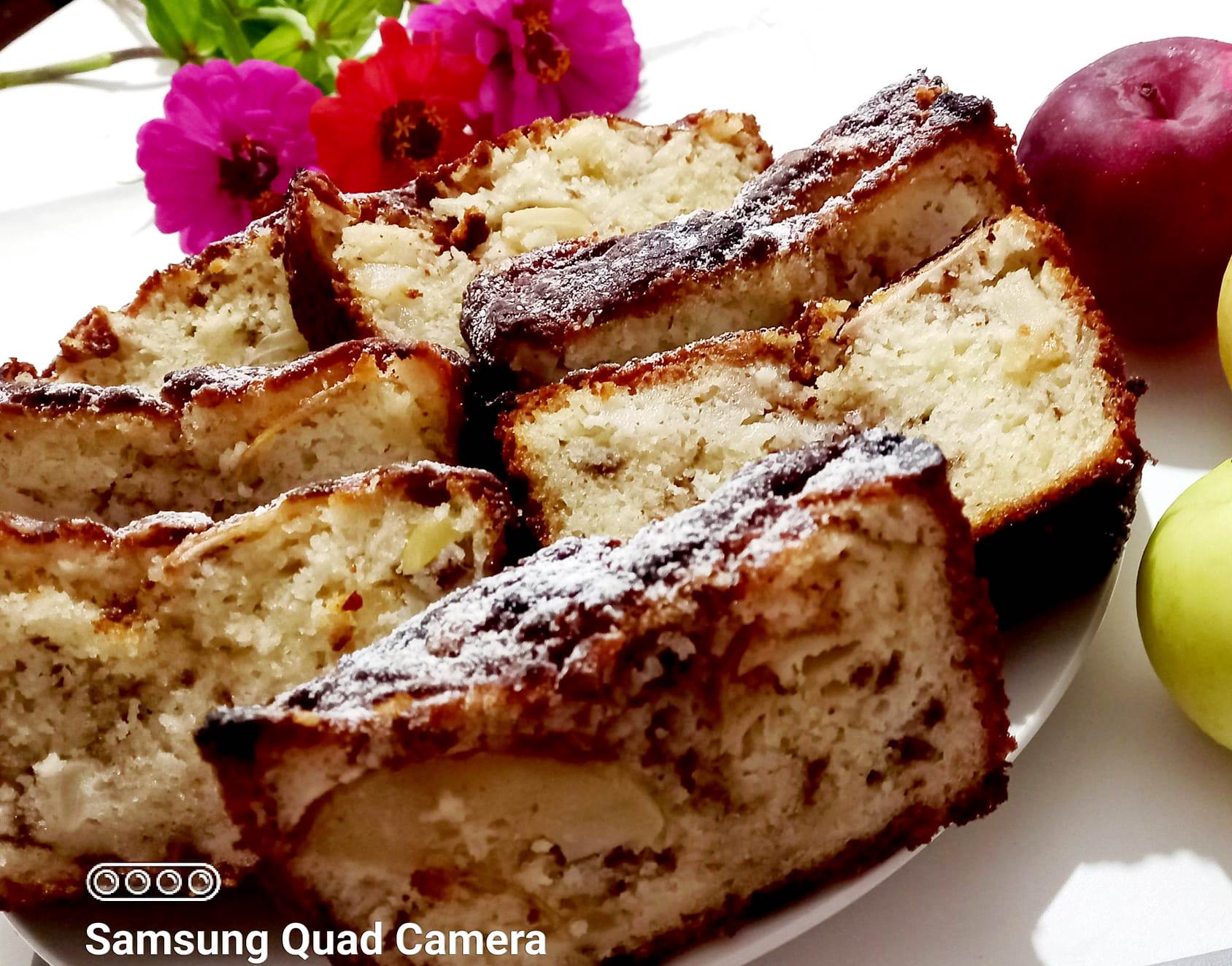 Ανακατεύουμε και αδειάζουμε στη φόρμα του κέικ. Κόβουμε το άλλο μήλο σε 2 μέρη, αφαιρούμε τα κουκούτσια, κόβουμε σε λεπτές φέτες και απλώνουμε από πάνω το μείγμα με τη φλούδα προς τα πάνω, χωρίς να τα πιέζουμε.
