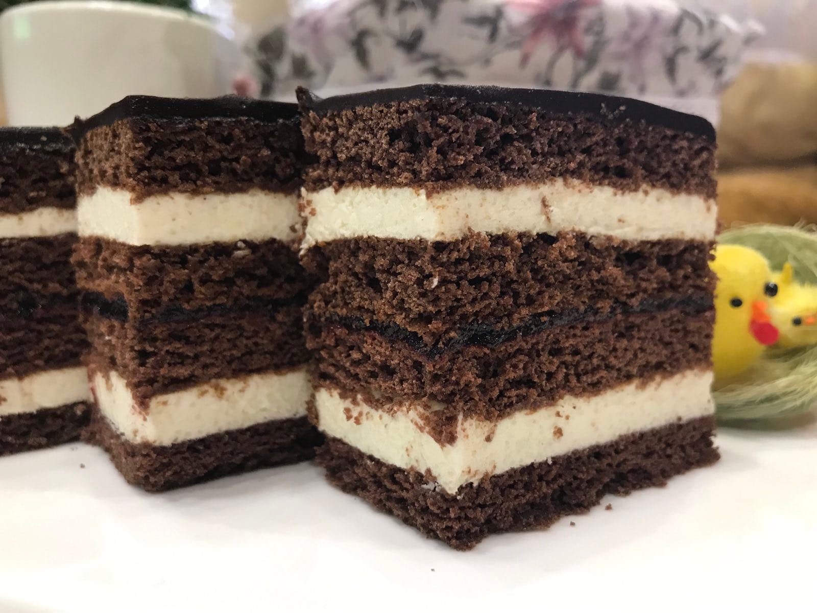 Κέικ + κρέμα + κέικ + μαρμελάδα + κέικ-κρέμα + κέικ.