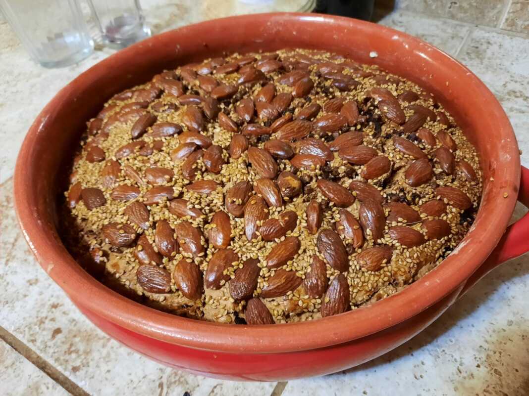 Καλύψτε την επιφάνεια γενναιόδωρα με σουσάμι. Τοποθετήστε τα ασπρισμένα ολόκληρα αμύγδαλα μεταξύ και γύρω από ότι γραψατε. Αλείψτε ελαφρά την κορυφή του κέικ με μείγμα επικάλυψης.