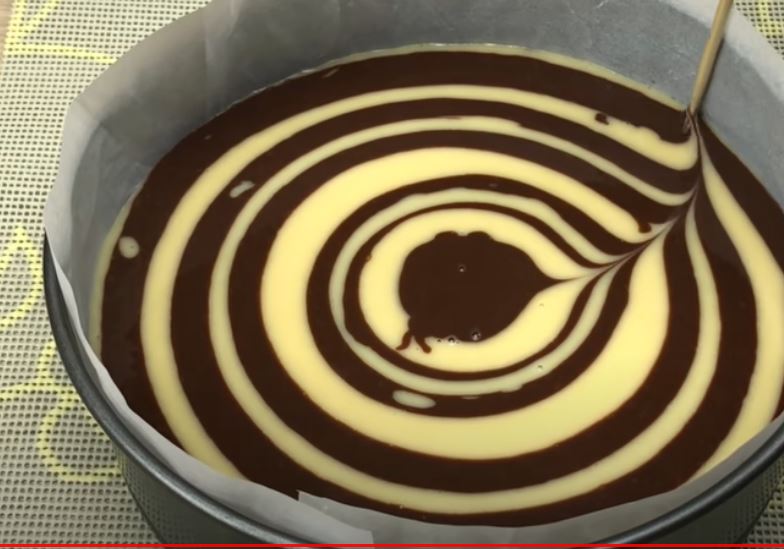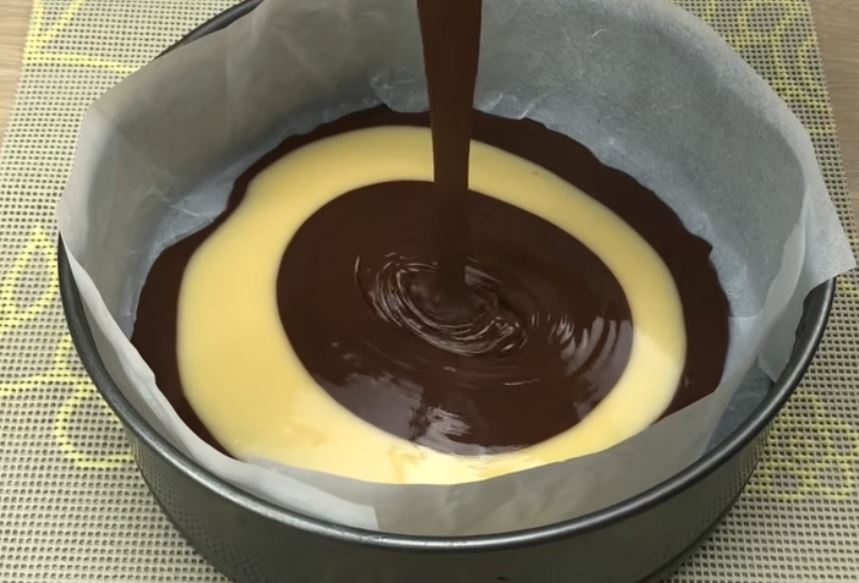 Στρώνουμε μία φόρμα με χαρτί στην βάση και στα πλαινά 22-24 εκ και ρίχνουμε πρώτα λίγο από σοκολατένιο μείγματος. Μετά λίγο από το λευκό μείγμα μετά πάλι σοκολατένιο και λευκό, επαναλαμβάνουμε το ιδιο μεχρι να εξαντληθούν.