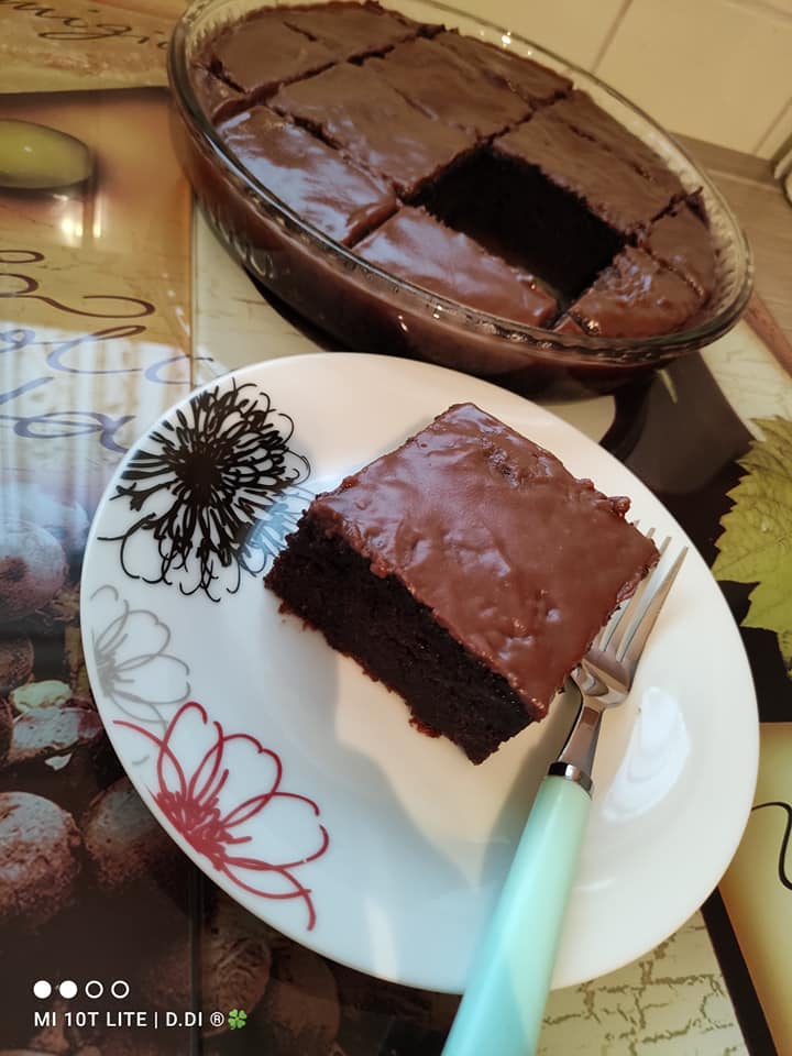 Χτυπήστε με ένα μίξερ σε μέτρια ταχύτητα για 3-4 λεπτά. Ρίχνουμε σε ένα λαδωμένο και αλευρωμένο ταψί και ψήνουμε σε προθερμασμένο φούρνο στους 170 ° μέχρι να είναι έτοιμο. Μετά την ψύξη, ρίχνουμε το γλασσο λιωμένου βουτύρου, σοκολάτας και 2 κουταλιές του γλυκού καφέ.