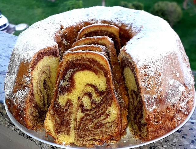 Τοποθετούμε ένα γυάλινο ή πλαστικό μπουκάλι (ανάποδα) στη μέση και ρίχνουμε το λευκό και το καφέ μείγμα εναλλάξ από πάνω για να σχηματιστούν σχέδια.