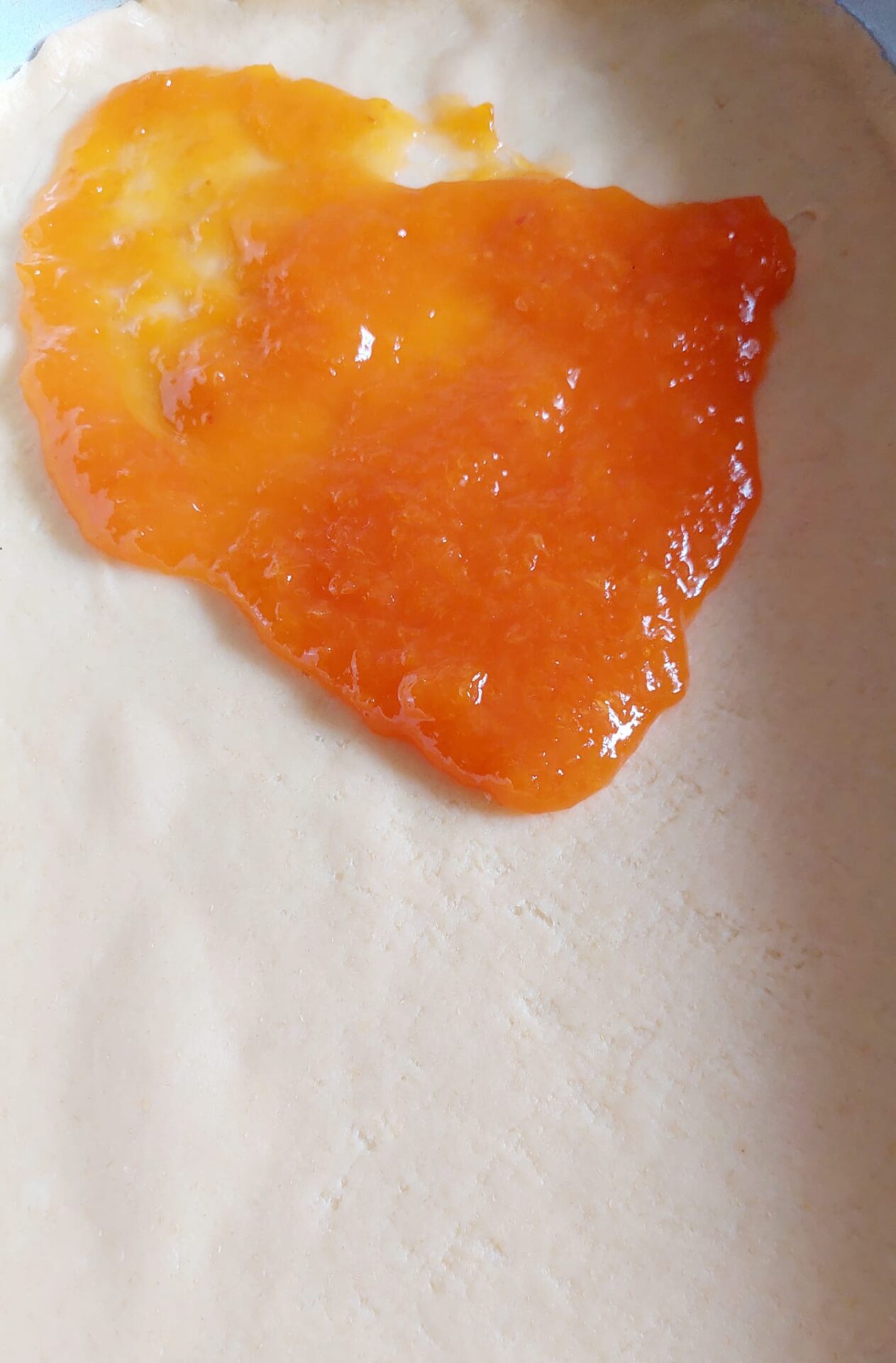 Το ταψί είναι 40cm x 24cm. Ανοιξτε το φύλλο στο μέγεθος ενός ταψιού. Βάλτε από πάνω 3 μεγάλες κουταλιές μαρμελάδα και απλώστε ομοιόμορφα.