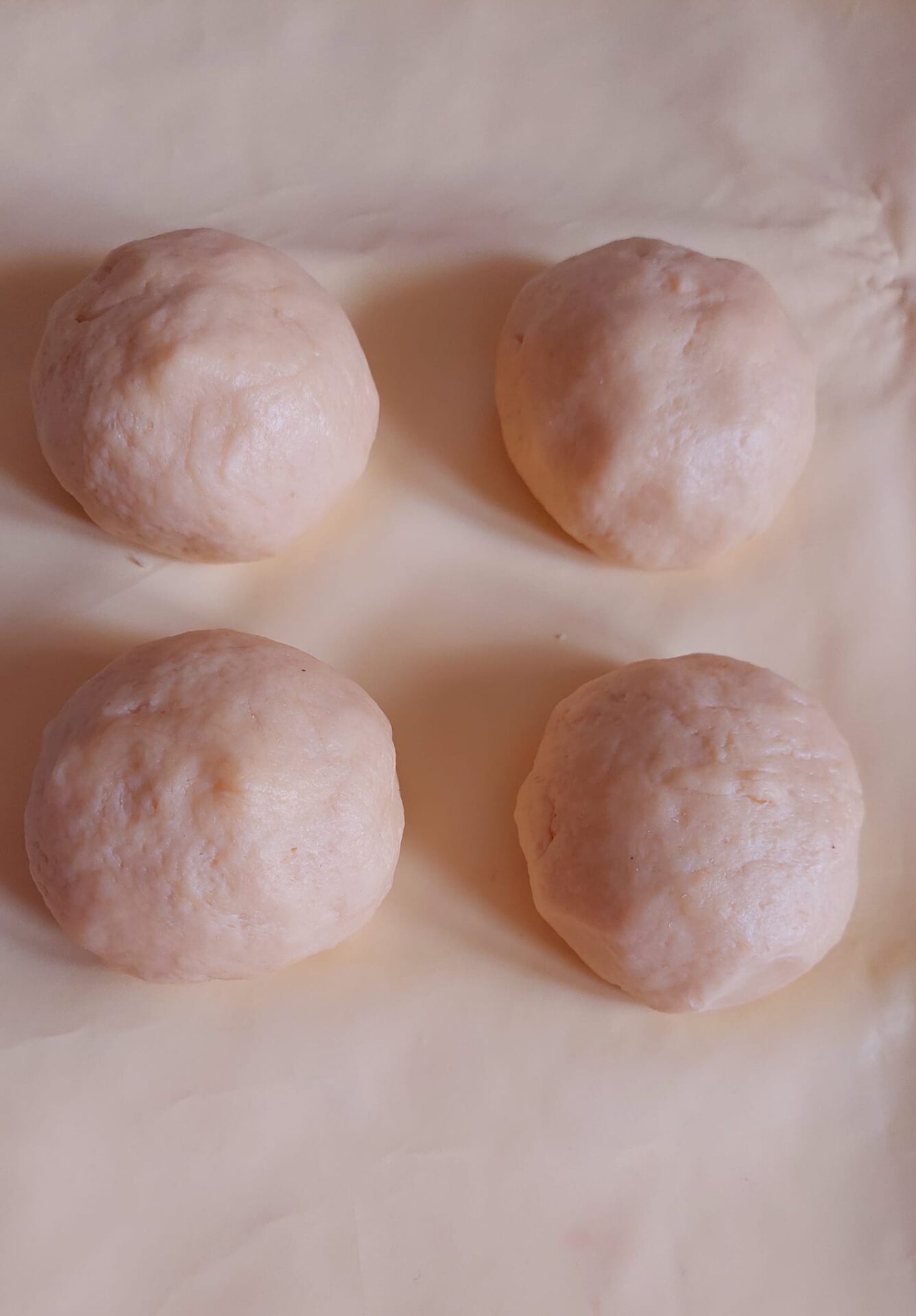 Παίρνετε μια λεία παχιά ζύμη βάρους περίπου 9oo gr. Από τη ζύμη φτιάχνουμε 4 κομμάτια των 220 γρ.
