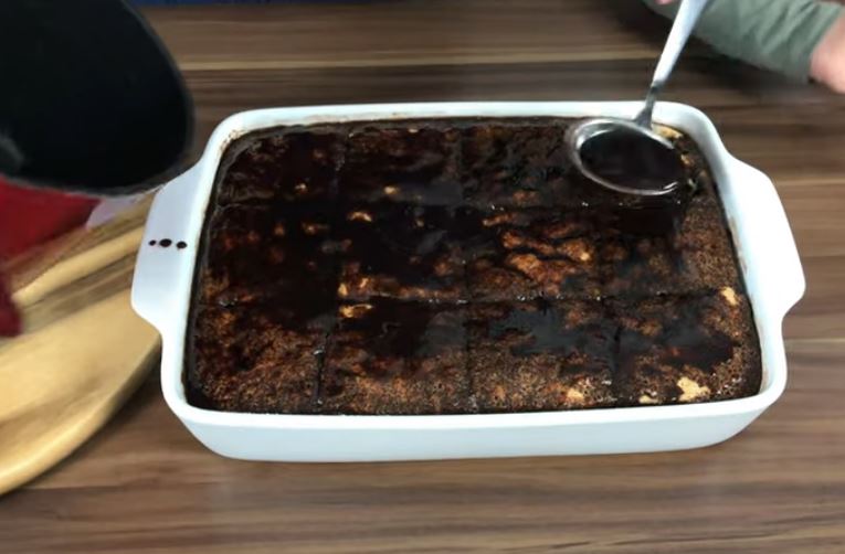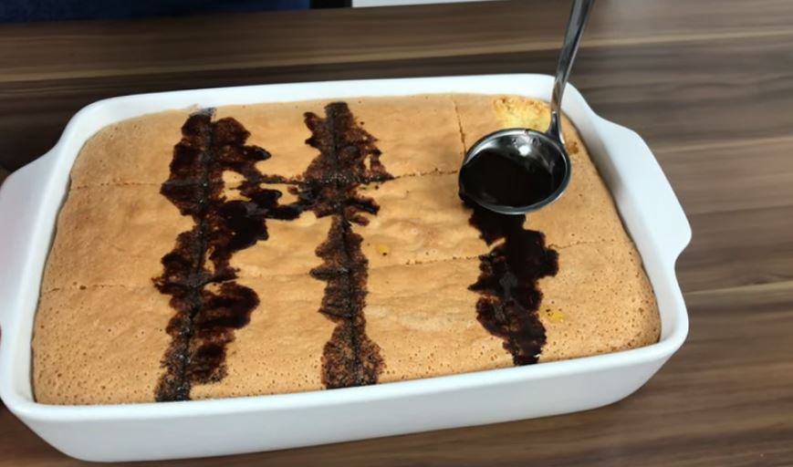 Ρίξτε το έτοιμο σιρόπι πάνω από το κέικ σταδιακά, πρώτα ανάμεσα στα αυλάκια και μετά πάνω του.