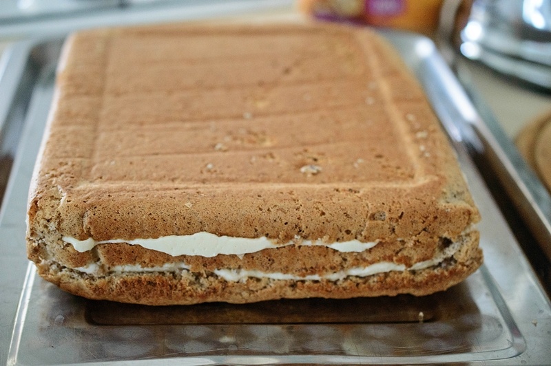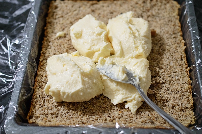 Συναρμολογούμε το κέικ στο ταψί στο οποίο ψήσαμε την βάση, στρωμένο με μια μεγάση μεμβράνη. Οταν κρυωσει η βάση κόβεται στα 3, η κρέμα χωρίζεται σε 2 και κατανέμεται ομοιόμορφα μεταξύ των βάσεων.